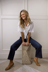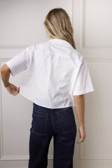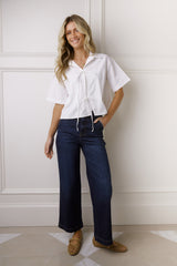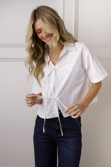 Elevate your wardrobe with the Elianna White Tie Front Top. This classic white top features a flattering sleeve length and ties down the front for a modern twist on the traditional collared blouse. Perfect for any occasion, this top will become a staple in your wardrobe.