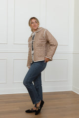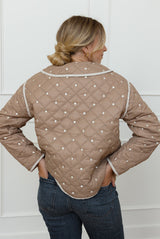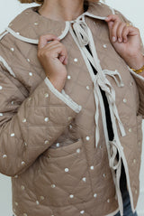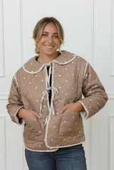 The Elizabeth Mocha Jacket combines timeless style with modern comfort. Its quilted design in a neutral mocha shade is beautifully enhanced with cream accents, creating a subtle yet refined contrast. Featuring delicate bow tie detailing down the front and a rounded collar, this jacket offers a slightly boxy fit for effortless layering and a chic silhouette. Perfect for elevating any outfit, it blends cozy warmth with sophisticated charm.