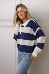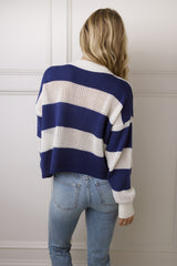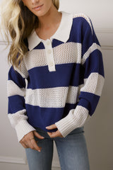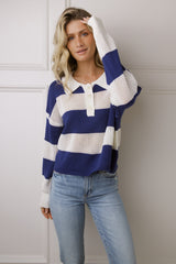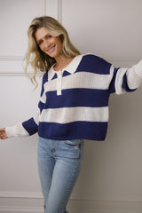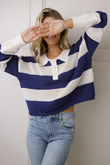 Indulge in the comfort and style of the Hayden Ivory & Blue Striped Sweater. This cozy knit features classic stripes + a boxy cropped fit, making it both trendy + versatile. The collar and henley style buttons on the neckline add a touch of sophistication to this must-have piece. Elevate your wardrobe with this irresistible sweater.