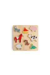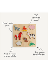 Introduce children to farm animals with our wooden farm puzzle. Crafted from FSC certified wood and non-toxic paint, this is a timeless toy designed to help teach little learners colors and spatial reasoning. The set includes eight barnyard animal themed pieces with smooth edges that are made for tiny hands. Littles will improve fine motor skills and hand-eye coordination as they grasp, manipulate and fit the pieces into their corresponding slots.