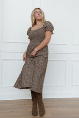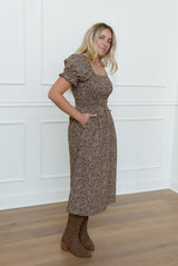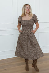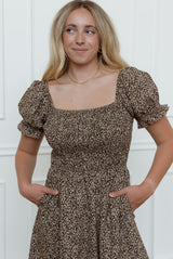 The Amani Floral Dress features a flattering square neckline and back, creating an elegant silhouette. Its stretchy bodice ensures a comfortable fit, while puff sleeves add a touch of romantic charm. Designed with hidden pockets for practicality, this dress combines style and function effortlessly. The neutral floral print makes it versatile for any occasion, offering timeless appeal and easy pairing with your favorite accessories.