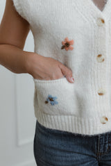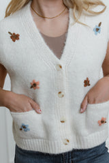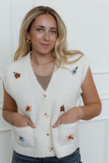 Elevate your layering game with the Annie Embroidered Vest, featuring delicate floral embroidery on a soft cream fabric. Its button-down front offers easy styling options, blending timeless charm with a modern touch. Perfect for adding subtle elegance to any outfit, this vest combines comfort and standout detailing effortlessly.