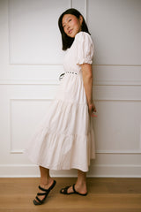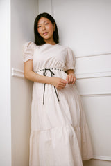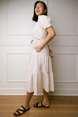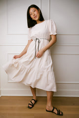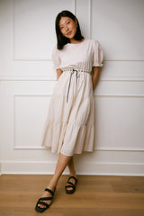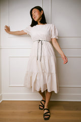 Get ready to turn heads in the Marlee dress! This tiered design features lined 100% cotton fabric and elastic cuff short sleeves for ultimate style + comfort. The neutral color is accented by a chic black ribbon waistline, adding a touch of elegance to this playful piece. Perfect for any occasion!
