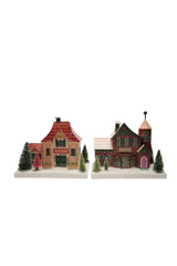 Bring festive magic to your holiday display with the North Pole Paper Houses. These charming village buildings feature LED lights, glitter accents, and bottle brush trees in vibrant colors with sugary details. Available in two styles, they add warmth and sparkle to any space—batteries required for an enchanting glow.