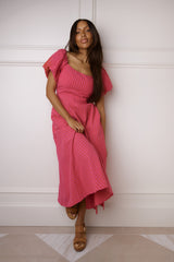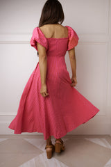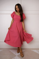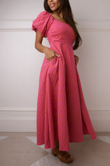Experience elegance and comfort with our Vanessa Pink Striped Dress! Featuring a stunning tone-on-tone color scheme and a square neckline, this dress will make you stand out in any crowd. The elastic cuff sleeves and smocked back provide flexibility, while the empire waistline and hidden side pockets add both style and convenience. Elevate your wardrobe with this amazing dress today!