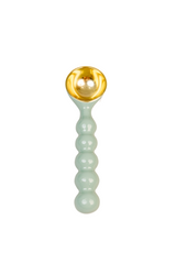 This mint and gold enameled aluminum ice cream scoop is a must-have for any ice cream lover. The ice cream scoop has a stunning design that features a mint enameled handle and a gold enameled scoop that glimmers in the light. The ice cream scoop is made of high-quality aluminum that is strong and lightweight, making it easy to scoop and serve ice cream. The handle is smooth and ergonomic, providing a comfortable grip and good leverage.