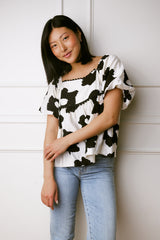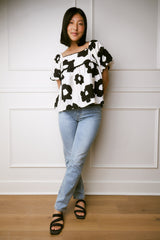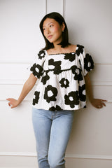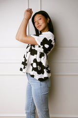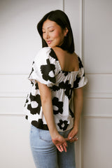Get ready to bloom in style with the Nina Black & White Floral Top. This top features a large scale floral print, a square neck and back, and black trim detailing for a touch of sophistication. The elastic cuff sleeves add a playful touch to this slightly cropped piece. Perfect for adding a pop of pattern to any outfit!