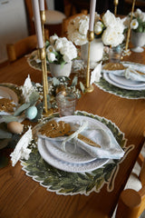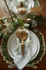 In collaboration with artist Elizabeth Foster, our Laurel Story creates a wonderful statement on your table. An elegant and iconic design, the Die-cut Laurel Wreath Placemat creates a perfect frame around your dinner plate. This timeless classic is beautiful paired with gold accessories and is stunning for weddings, anniversaries, holiday parties and more!
