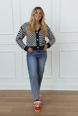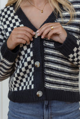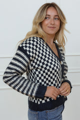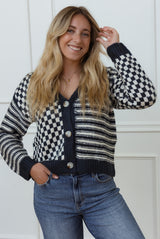 The Abigail Navy & Cream Cardigan features a playful mix of contrasting stripes and checks that effortlessly coordinate in neutral tones. With a relaxed fit and cropped length, it offers comfortable style that's easy to layer. Buttoned down the front for versatility, this cardigan adds a fun, fresh touch to any outfit. Perfect for those who love subtle yet striking design details.