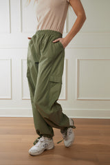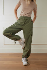 Introducing the Kendall Parachute Bottoms! These jogger style pants feature an elastic waistline for ultimate comfort and a neutral green color for versatility. The adjustable drawstring jogger style makes them cinch to perfection at your desired length on your leg. Perfect for everyday wear. Upgrade your wardrobe with this must-have option.